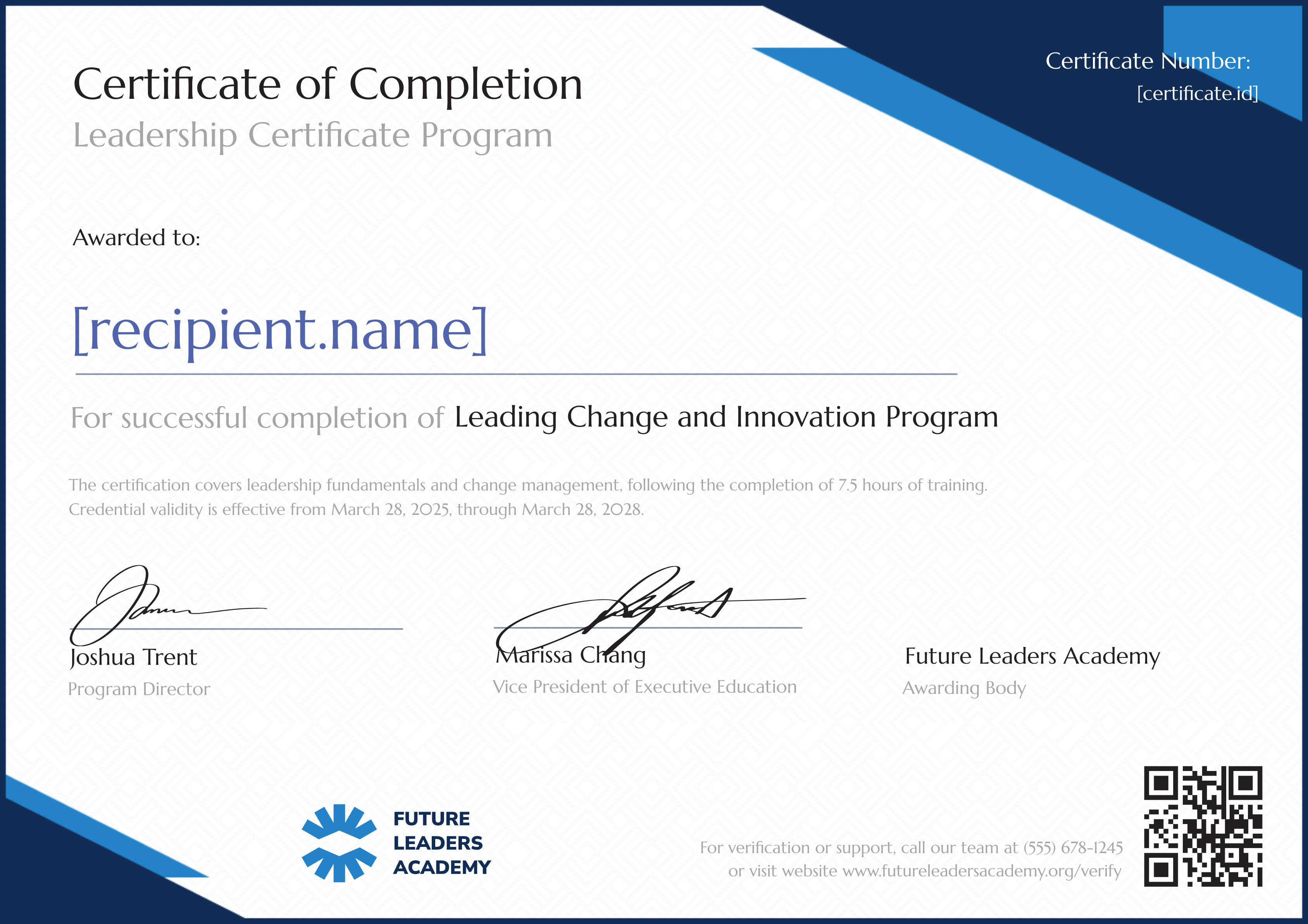 Learners must attend all scheduled sessions and actively engage in leadership discussions, team exercises, and collaborative problem-solving activities. This criterion ensures participants develop practical leadership skills through real-time interaction, peer learning, and immediate application of change management concepts.t Learn More
